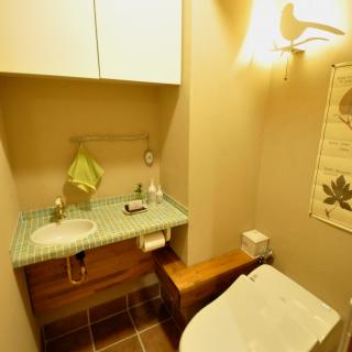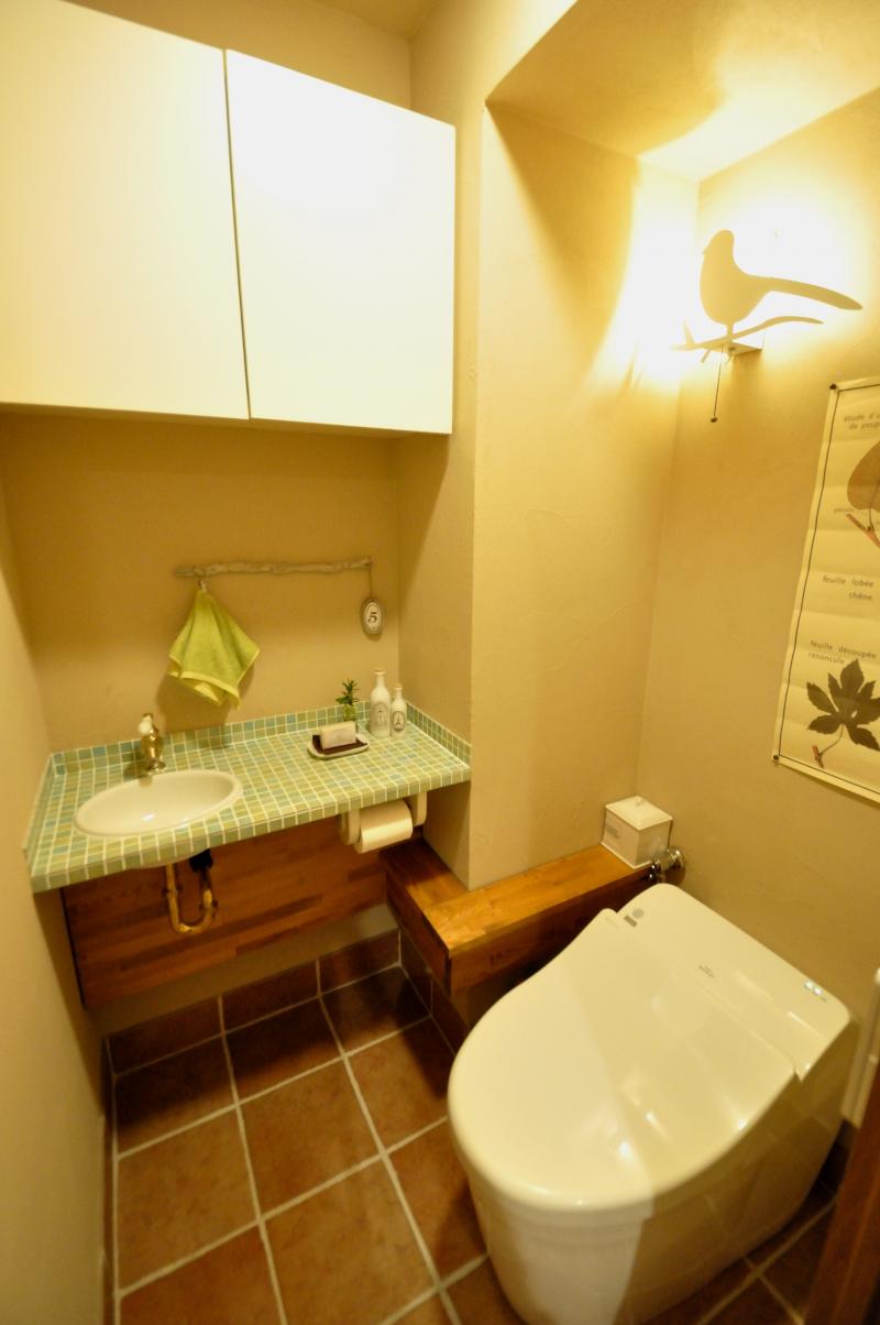 差し色のグリーンを利かせたモザイクタイルが可愛い手洗いカウンターを造作。床はテラコッタ風のタイル仕上げ。
