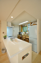 キッチンはリビングの家族といつでもコミュニケーションとれるよう、垂れ壁を撤去しオープンに。明かり取りを兼ねて子供部屋へとつながる小窓も設けました。
