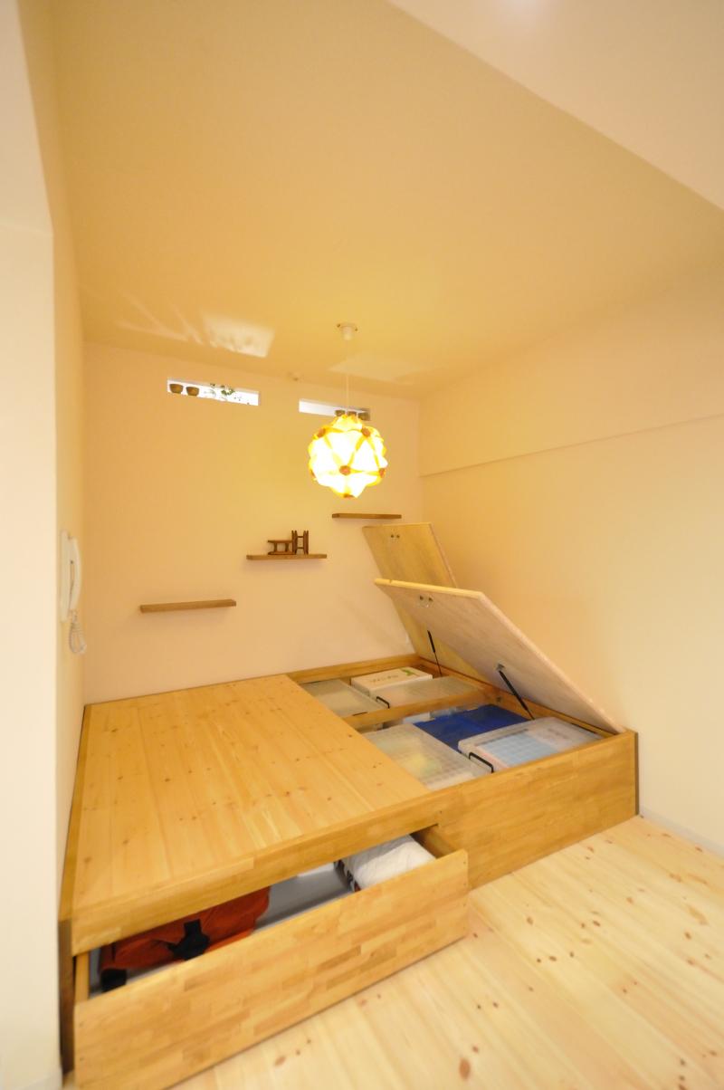 リビングの一角は収納たっぷりの小上がり。夜には主寝室にもなります。