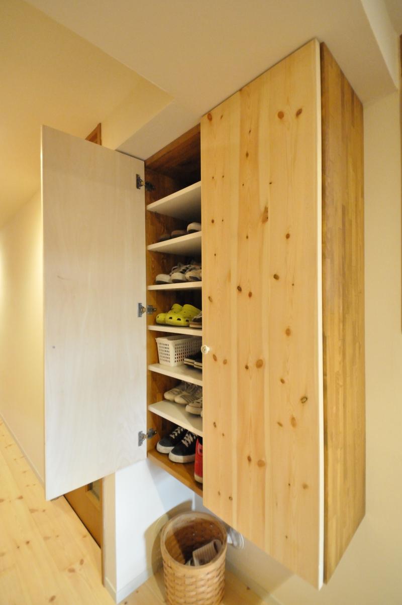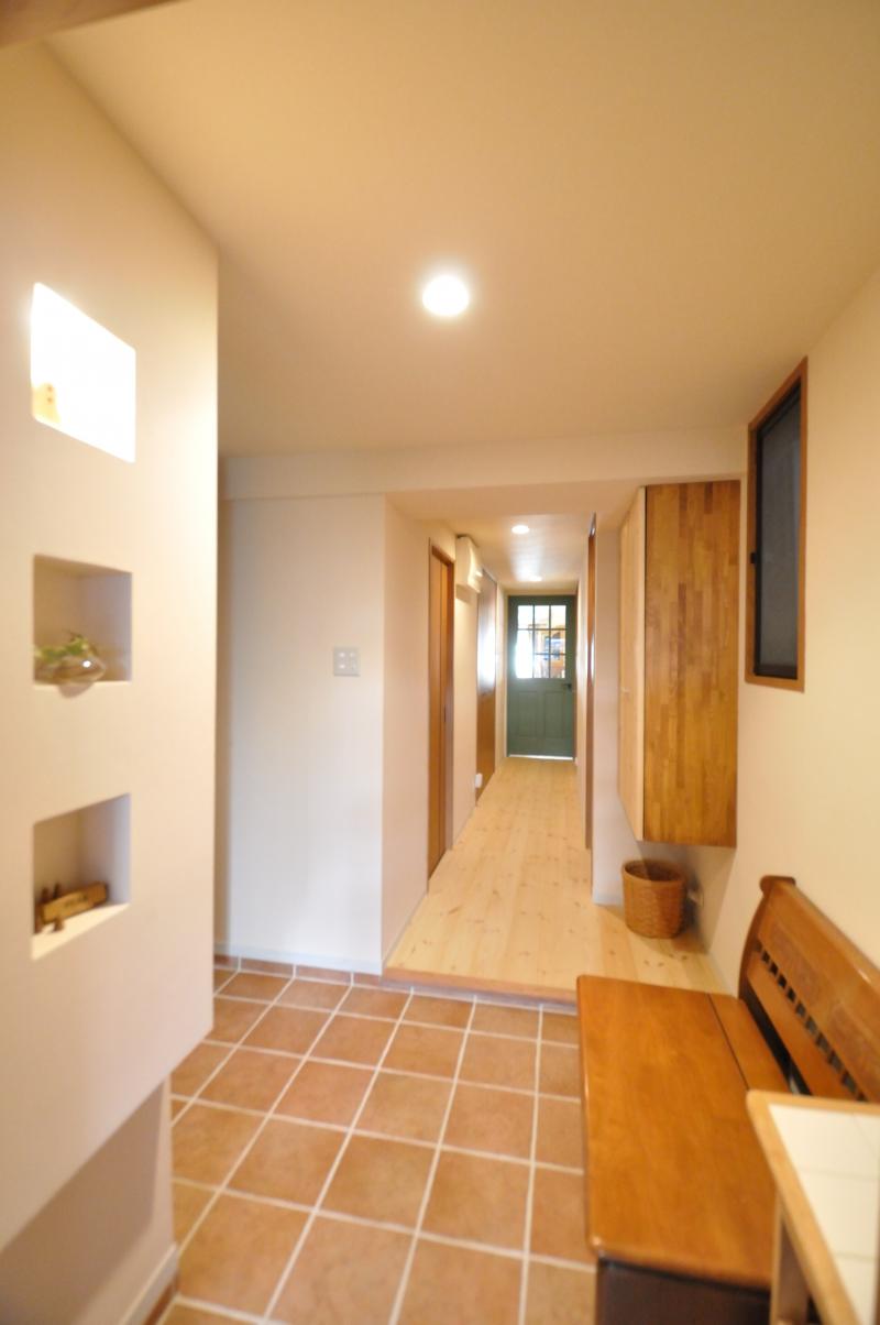 家族5人分の靴が軽々と収納できる下駄箱を造作。玄関から左に進むと同じテラコッタ風タイルで仕上げたトイレと、ご長男のお部屋に続く。