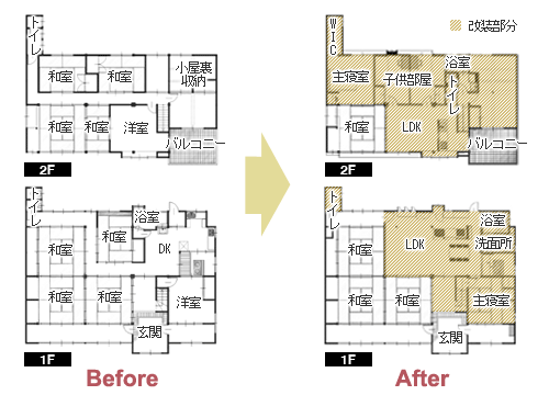 | リフォーム箇所 | 1.2階全面(キッチン、リビング、ダイニング、トイレ、洗面所、浴室、寝室)、耐震補強 |