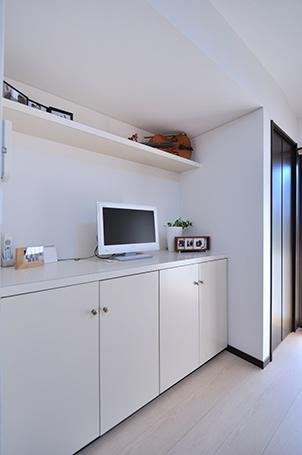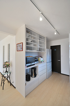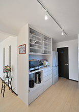 冷蔵庫の奥行きと揃えてカップボードを造作。収納力&使い勝手が良くなりました。
