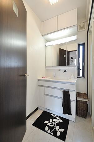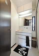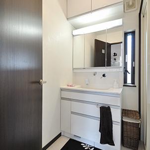 洗濯機をキッチン横に移動して、洗面台のサイズアップが可能に。収納力もアップ!