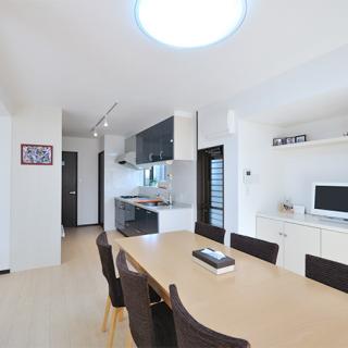 開放的なリビングダイニングは、壁を取り払いながらも筋交いは残し、必要な耐震性を確保。天井やクロスに合わせて白くお化粧して、空間に馴染ませています。