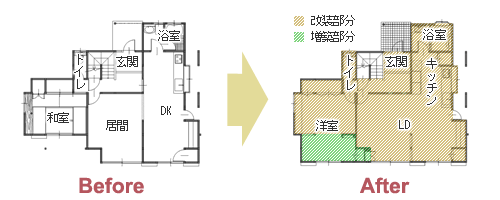 | リフォーム箇所 | リビング、ダイニング、キッチン、トイレ、洗面所、浴室、玄関、廊下、増築 |