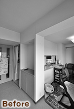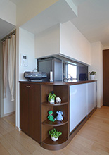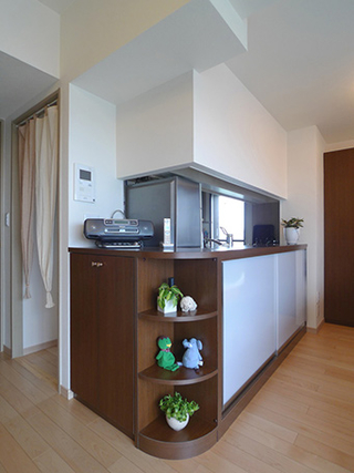 風通しが悪く熱気がこもりがちだったキッチンは、袖壁を取り除き風の通り道と開放感をアップ!きれいにお使いだったキッチン本体はそのまま生かしコストも削減しました。