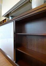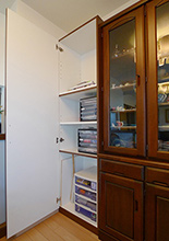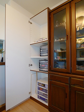 キッチンカウンター下と食器棚のとなりには、大容量のオリジナル収納。内装とインテリアに合わせて、ホワイト&ダークブラウンで仕上げました。