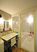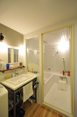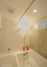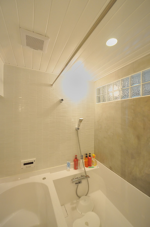 白を基調とした清潔感あるバスルーム。モルタルで仕上げた側面の壁にはガラスブロックを入れアクセントにしました。