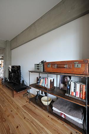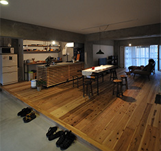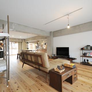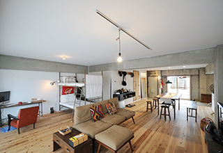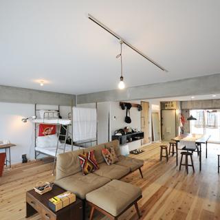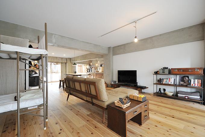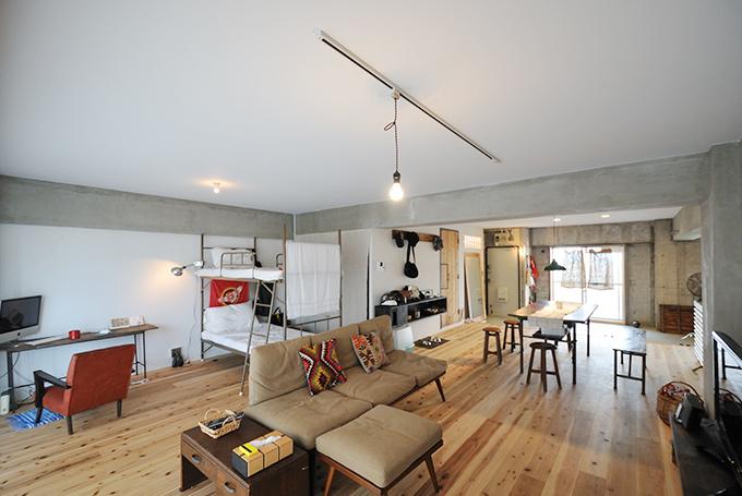 ほとんどの壁を取り除きスケルトン状態まで戻したワンルーム。柱・梁は躯体のモルタルを生かし、天井と壁は白く塗装。床はスギの無垢板を使いシンプルに仕上げました。