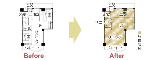 | リフォーム箇所 | 全面(リビング、ダイニング、キッチン、トイレ、洗面室、浴室、玄関) |