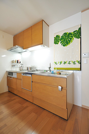 以前はホールにミニキッチンがありましたが、使い勝手が悪くほとんど使われていませんでした。 配管の関係で対面型キッチンにはできなかったものの、家族が同じ部屋で過ごせるよう、納戸があった場所にキッチンを移動。お子様とのコミュニケーション機会も格段に増えました。