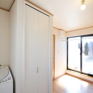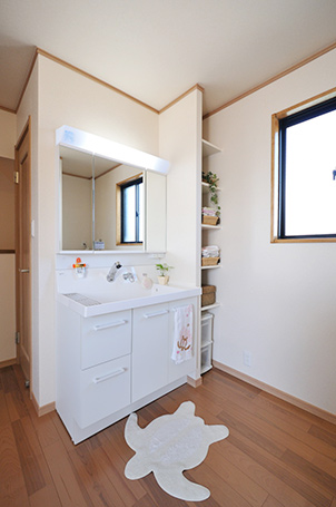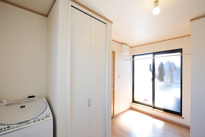 新しい洗面化粧台と洗濯機、タオルや掃除機を収納するスペース、サッシの前には室内物干しを設けました。