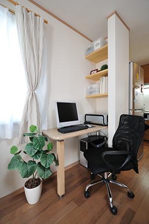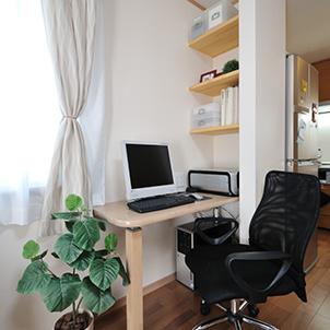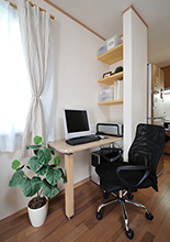 LDKの窓際に移動させ、PCカウンターと壁を利用した本棚を造作し、乱雑になりがちなPCコーナーをスッキリとさせました。いつでも家族一緒に使えます。