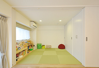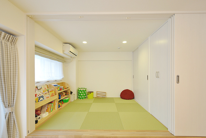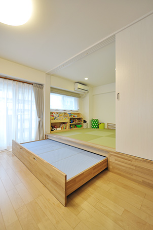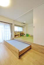 昼はリビング兼子供部屋、夜は寝室の畳コーナー。お子様が寝た後に起こすことのないよう、床下は引き出し式のベッドに工夫。3枚引込み戸でリビングと分けることも可能です。