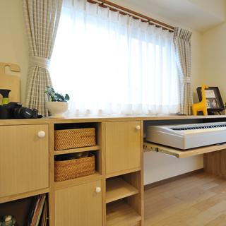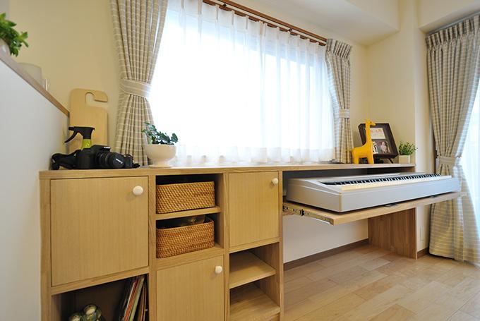 家具をあまり置かなくてすむように、カウンター収納を造作。電子ピアノはスライドさせるだけで使用できるようにサイズを合わせました。
