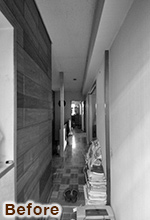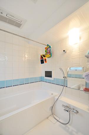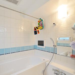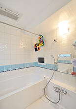大きな梁があり、ご希望していたサイズのユニットバスが入らなかった為、ハーフバスをご提案。タイルは表面に表情がある物を貼る事で冷たい感じにならず、ブルーの色がアクセントなさわやかな浴室に。