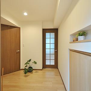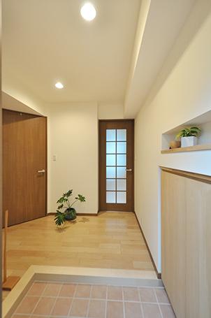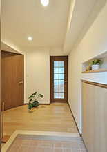 玄関収納を隣接する一段上がった畳コーナーとの高低差を有効利用し、押入の下部に設置。それにより玄関全体が明るく広々となりました。