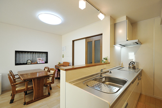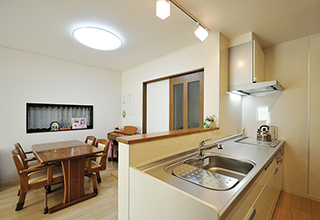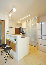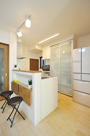 廊下をなくし広くなった部分を利用した対面キッチンは、カウンターに折りたたみ式のテーブルを設置。奥様がお夕飯を作っているときにお嬢さんが勉強をしていても、顔を合わせて会話ができる設計です。
