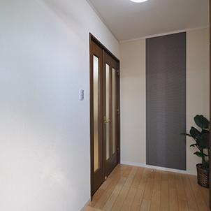 正面の壁には絵画などを飾れるよう、中央にアクセントクロスを施しています。