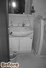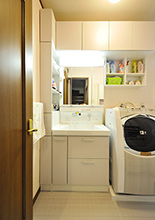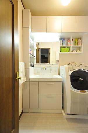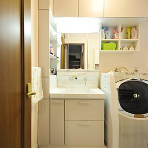 その隙間を利用したトールキャビネット付の洗面化粧台を設置。ヘアセットや小物等を収納するなど、使い勝手が良くなりました。