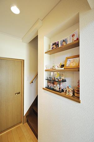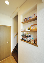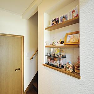 生活していると必ず目に入るこの場所に、家族の思い出の写真や小物が飾れるニッチを設置。お嬢さんの成長が楽しめる写真が何枚も飾られています。