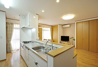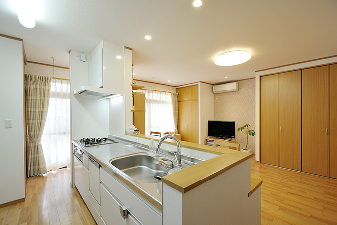 お母様と奥様が並んでお料理ができるアイランド式の対面キッチン。食器洗い乾燥機をシステムキッチンに組み込み、すっきりと使い勝手もよくなりました。