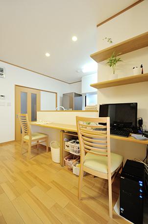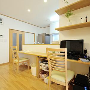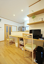 レンジフード前の抜けない柱を生かしてカウンターと飾り棚を造作。パソコンをしたり軽食を取ったりと色々な場面で活躍します。