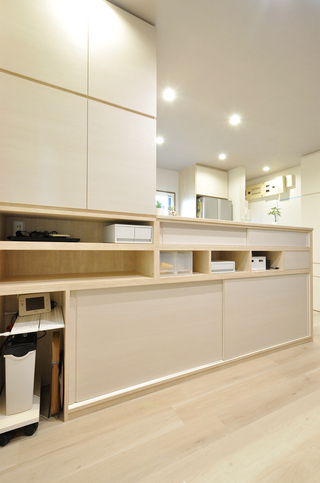 造作の収納はミリ単位で設計し、H様のご要望を詰め込んだ唯一の収納になります。AICAメラミンの面材を内部・外部で色を分け、木部はキッチンに色を近づけました。天板下のユニットはキッチン側まで貫通しており、直接お皿等を片付け、ダイニング側から準備できます。