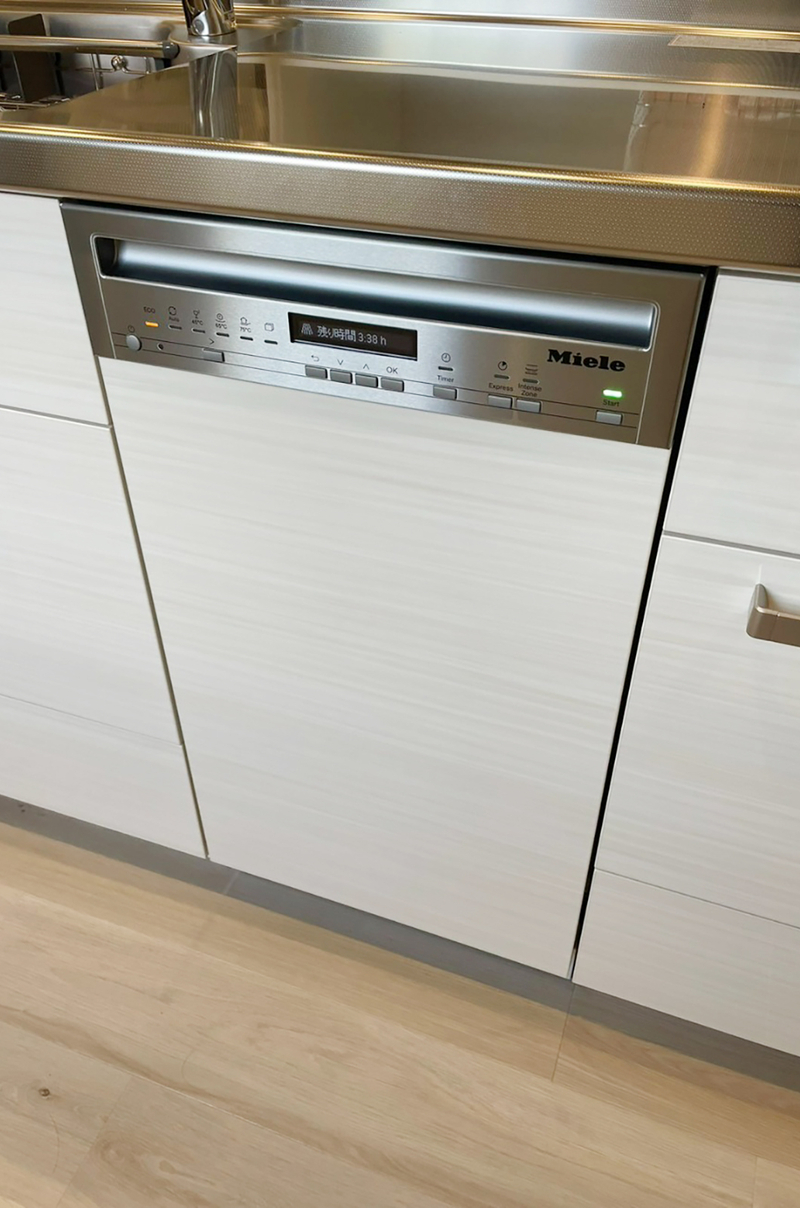 清掃性の高いレンジフードとミーレ食洗機を搭載したキッチン(LIXIL/リシェル、W=2700)にリニューアル。使い易さ抜群です。
