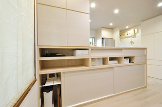 キッチンはLIXIL/リシェルをご選択頂き、ミーレの食洗機やよごれんフード等家事ラクオプションを搭載しております。そのキッチンにミリ単位で設計したのが、造作の対面収納です。どこに何を入れるか、キッチン側・ダイニング側 双方からの使いやすさをとにかく追求されました。