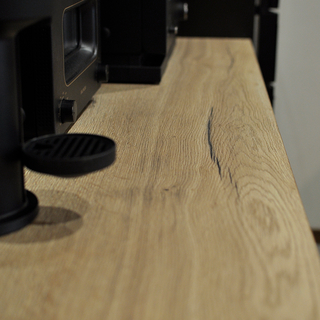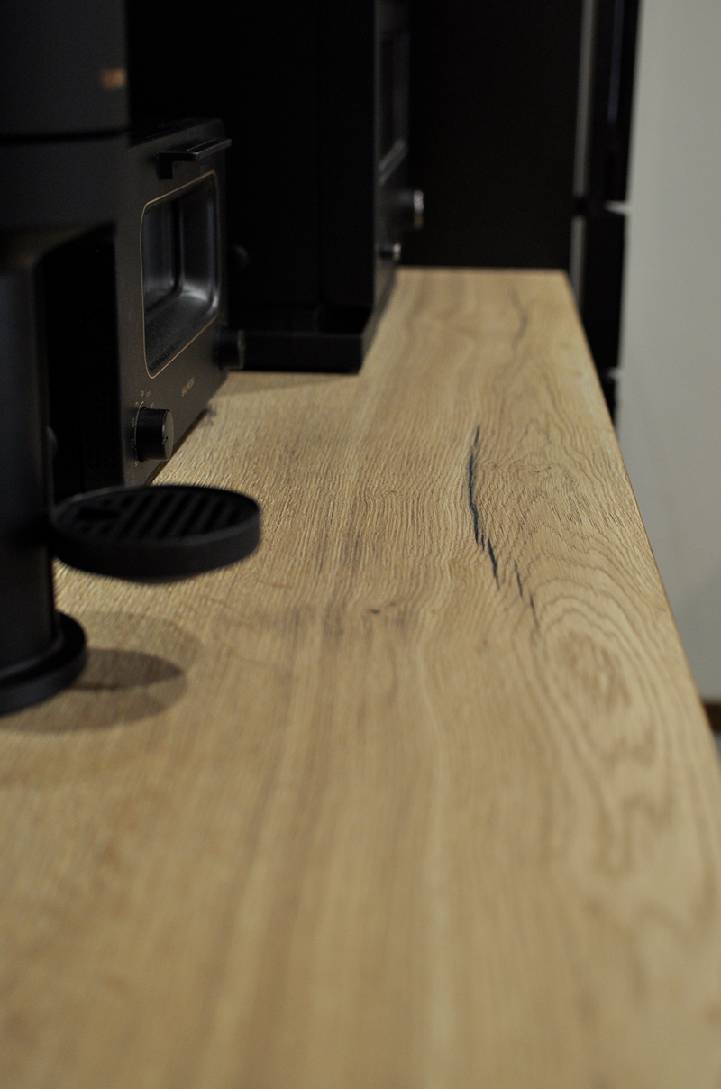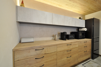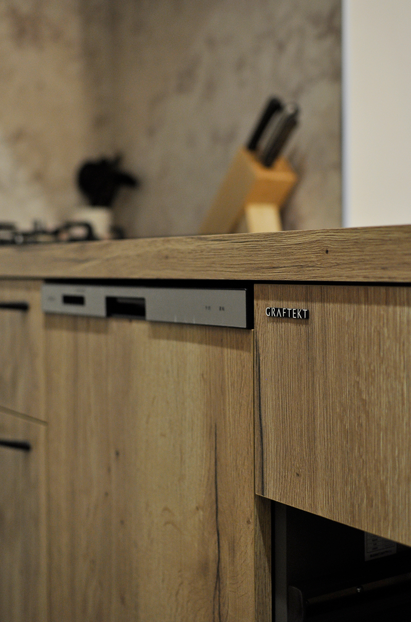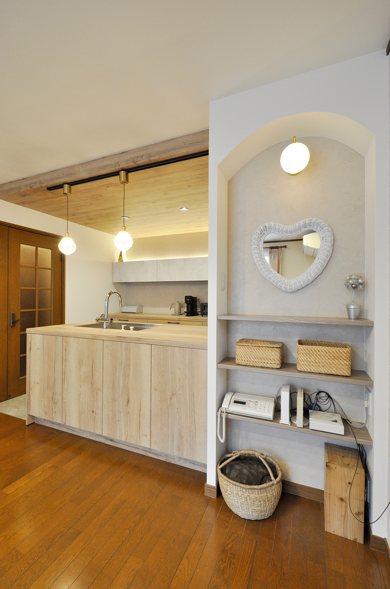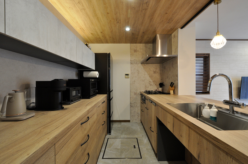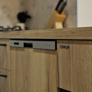 色々なメーカーショールームを見学してきた中で一目惚れしたGRAFTEKTのキッチンを採用。お気に入りの木目調の天板が生きるよう、フラット天板のオープンなレイアウトに。レンジフードのダクトを隠すため、キッチン部分のみ天井を下げ、キッチン柄と親和性の高い木目調のクロスでアクセントにしています。床はグレーのフロアタイルを上貼り、キッチン背面・収納面の壁はベージュのクロス、キッチンパネルは石目調と全体にグレーやベージュのお色合いで、落ち着いた印象のキッチンに仕上がっています。