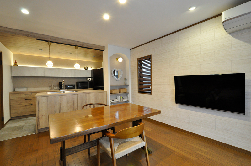 キッチンとダイニングの間の壁は、耐震性能の関わる耐力壁だったためそのまま残し、カウンターを取り付けて奥様のメイクスペースに。テレビは壁掛けにして部屋を広く使用できるようにしています。照明はダウンライトにしてスッキリと。調光可能なので昼夜と雰囲気に合わせて明るさを変更できます。