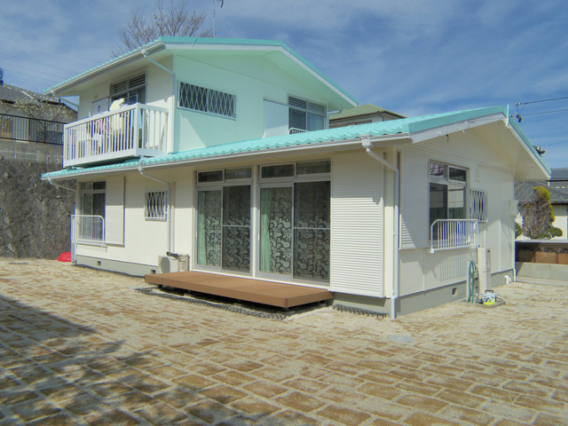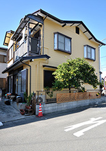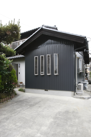 新設したワインレッドの玄関ドアに合わせて、外壁はチャコールグレーの外壁材に...