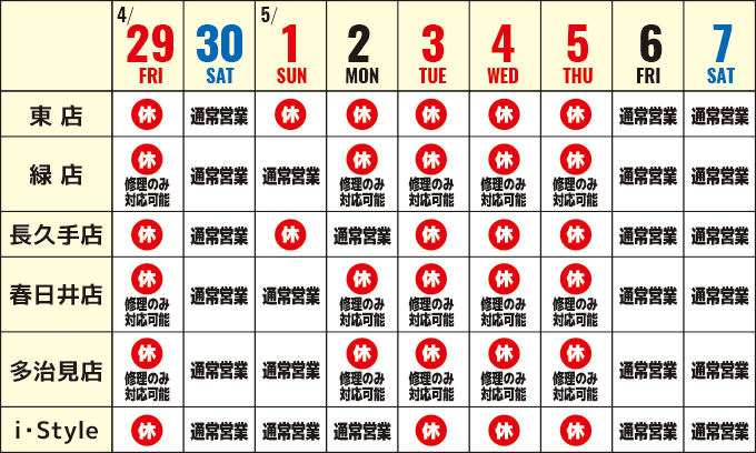 なお修理・メンテナンスにつきましては、期間中も休まず対応をしております。何かお困りごとがございましたらどうぞお気軽にお電話ください。