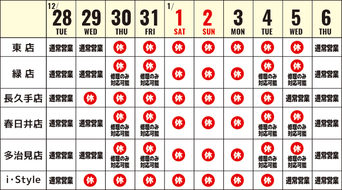 なお12月30日、12月31日、1月4日、1月5日は修理・メンテナンスのみ対応をしております。何かお困りごとがございましたらどうぞお気軽にお電話ください。