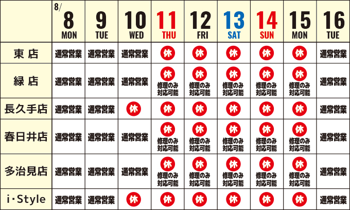 なお修理・メンテナンスにつきましては、期間中も休まず対応をしております。何かお困りごとがございましたらどうぞお気軽にお電話ください。