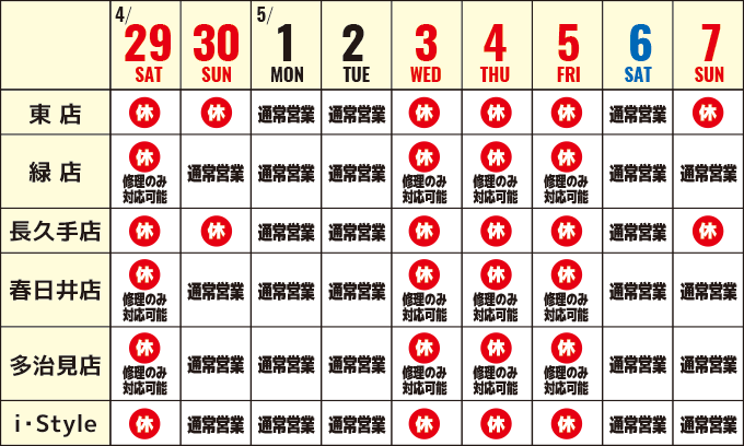 なお修理・メンテナンスにつきましては、期間中も休まず対応をしております。何かお困りごとがございましたらどうぞお気軽にお電話ください。