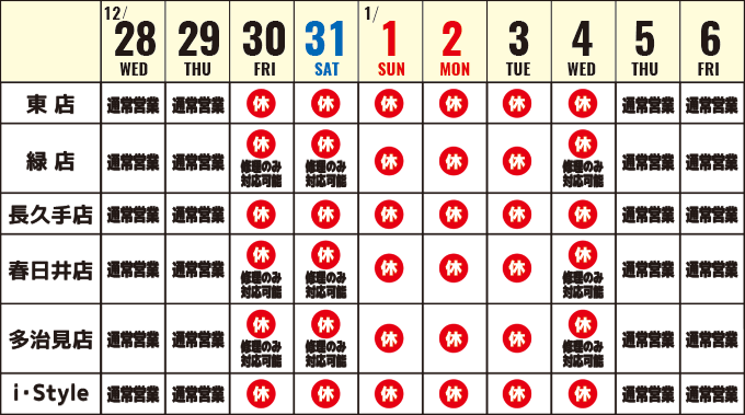 なお12月30日、12月31日、1月4日は修理・メンテナンスのみ対応をしております。何かお困りごとがございましたらどうぞお気軽にお電話ください。