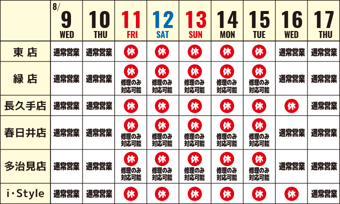 なお修理・メンテナンスにつきましては、期間中も休まず対応をしております。何かお困りごとがございましたらどうぞお気軽にお電話ください。