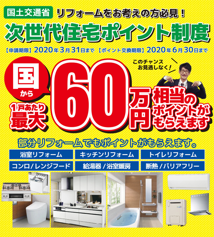 2020年02月20日 次世代住宅ポイント制度 お見積もりキャンペーン実施中です! 次世代住宅ポイント制度とは、消費税率10%が適用される一定の省エネ性、耐震性、バリアフリー性能等を満たす住宅や家事負担の軽減に資する住宅の新築やリフォームをされた方に対し、さまざまな商品と交換できるポイントを発行する制度です。 ポイントは最大60万円相当が取得でき、リフォームをお考えの方は必見の情報です。 詳しくは下記URLより、特設ページヘGO! https://www.moreliving.co.jp/topics/002.html