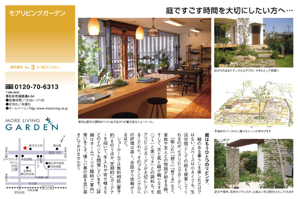 2008年12月15日 【Live+ie/リヴィエ Vol,46】に掲載されました。 住まいと暮らしの情報誌【Live+ie/リヴィエ Vol,46】にモアリビングガーデンが掲載されました。ぜひご覧下さい。 ⇒ 掲載記事を見る リヴィエの入手方法 東海3県の主要住宅展示場やショールーム、愛知県下の主要書店で無料配布されています。 当ショップにもございますので、ご入用の方は当店スタッフまでお気軽にお申し付けください。 ⇒ モアリビングの庭/ガーデニング事例