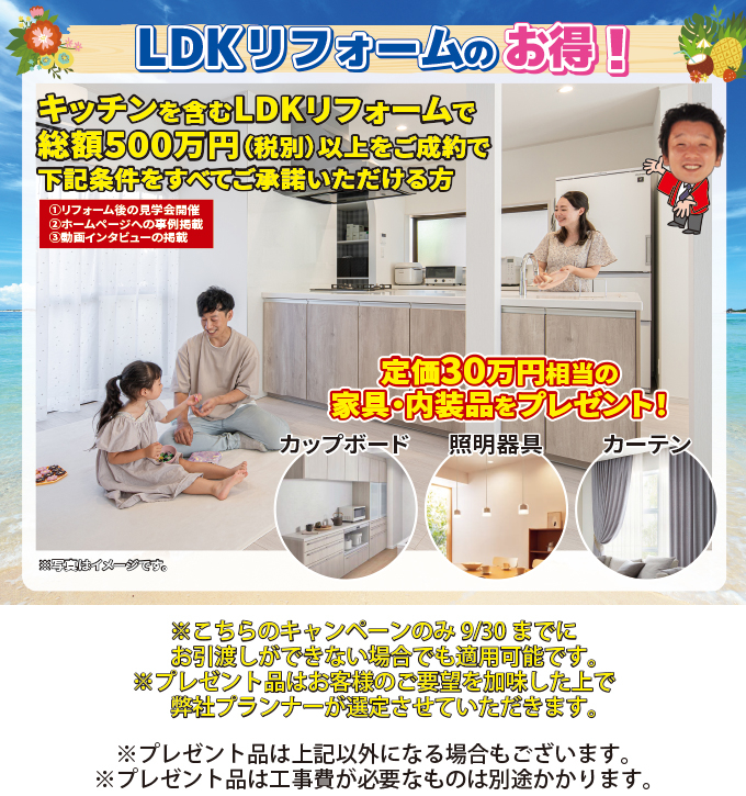 キッチンを含むLDKリフォームで総額500万円(税別)以上をご成約で下記条件をすべてご承諾いただける方