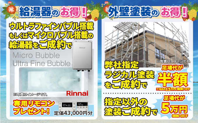 ①弊社指定ラジカル塗装をご成約で足場代が半額! ※MAX15万円(税別)OFF
