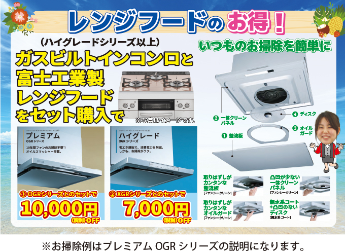 ①OGRシリーズのレンジフードとのセットの場合は10,000円(税別)OFF