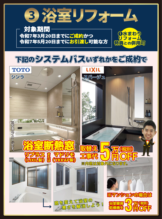 下記のシステムバスいずれかをご成約で浴室断熱窓(LIXIL/リプラス、YKKAP/マドリモ)の取替え工事代5万円(税別)OFF!
