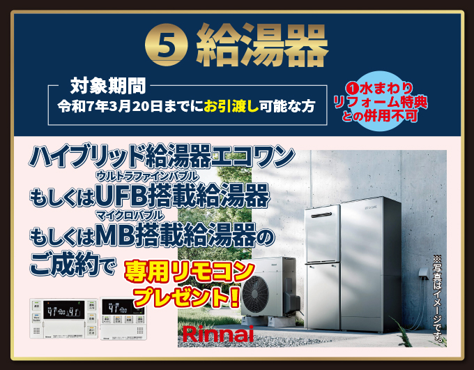 ハイブリッド給湯器エコワンもしくは、ウルトラファインバブル搭載給湯器もしくは、マイクロバブル搭載給湯器のご成約で専用リモコンプレゼント!