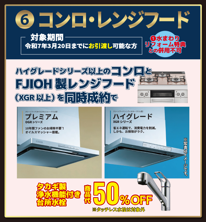 ハイグレードシリーズ以上のコンロとFJIOH製レンジフード(XGR以上)を同時成約でタカギ製浄水機能付き台所水栓、商品代50%OFF<