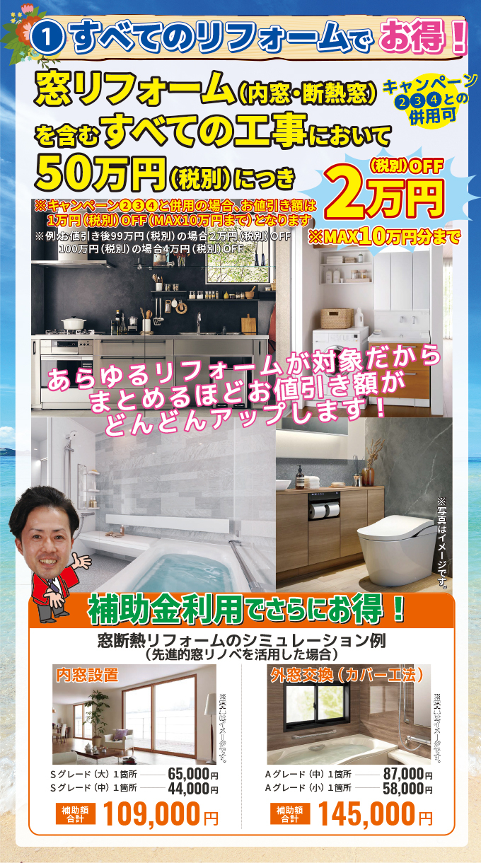 窓リフォーム(内窓・断熱窓)を含むすべての工事において50万円(税別)につき2万円(税別)OFF(※MAX10万円まで)