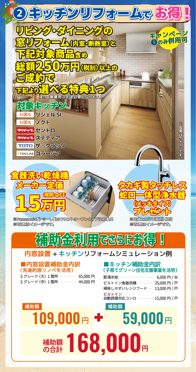 リビング・ダイニングの窓リフォーム(内窓・断熱窓)と下記対象キッチン含め総額250万円(税別)以上のご成約で下記より選べる特典1つ(※工事費用は別途必要となります。)