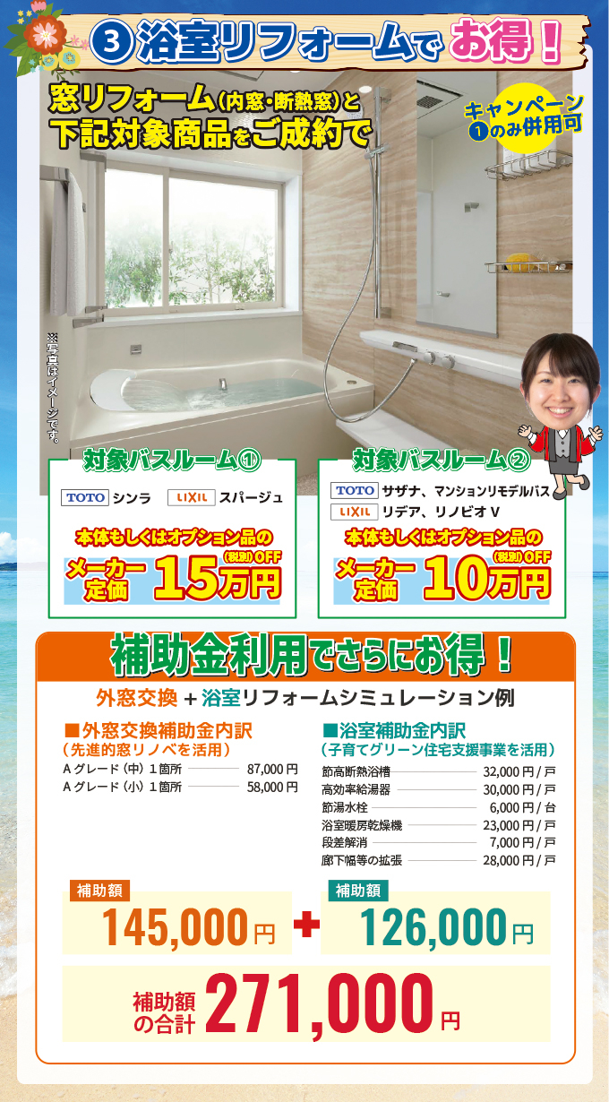 窓リフォーム(内窓・断熱窓)と下記対象バスルーム をご成約で